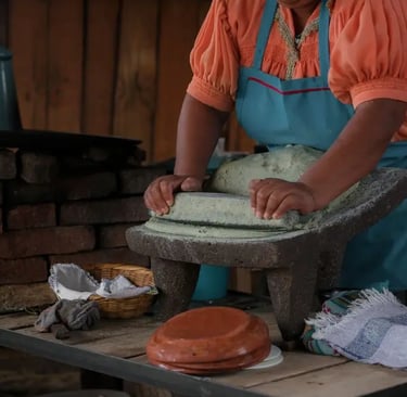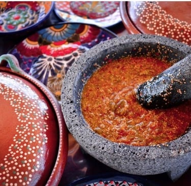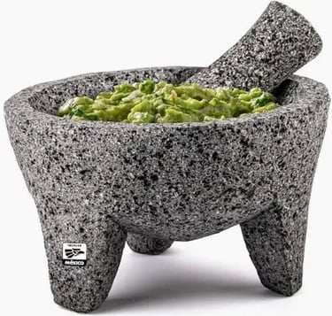 Long before stainless steel and blenders, Mexican kitchens relied on volcanic stone. The molcajete (mortar and pestle) is where salsas become more than sauce, where chile, garlic, and tomato release their oils and merge into something alive with texture and heat. The metate broad, flat, and ancient, was used to grind maiz into masa and cacao into silky paste, the foundation of chocolate drinks and the beginning of every great mole. To use these tools is to connect directly with centuries of culinary wisdom.